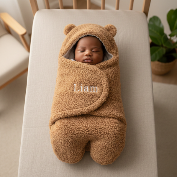 Ultra-soft lamb fleece swaddle designed to keep your baby warm, secure, and sleeping peacefully. Easy to use, safe, and personalized with your baby’s name.